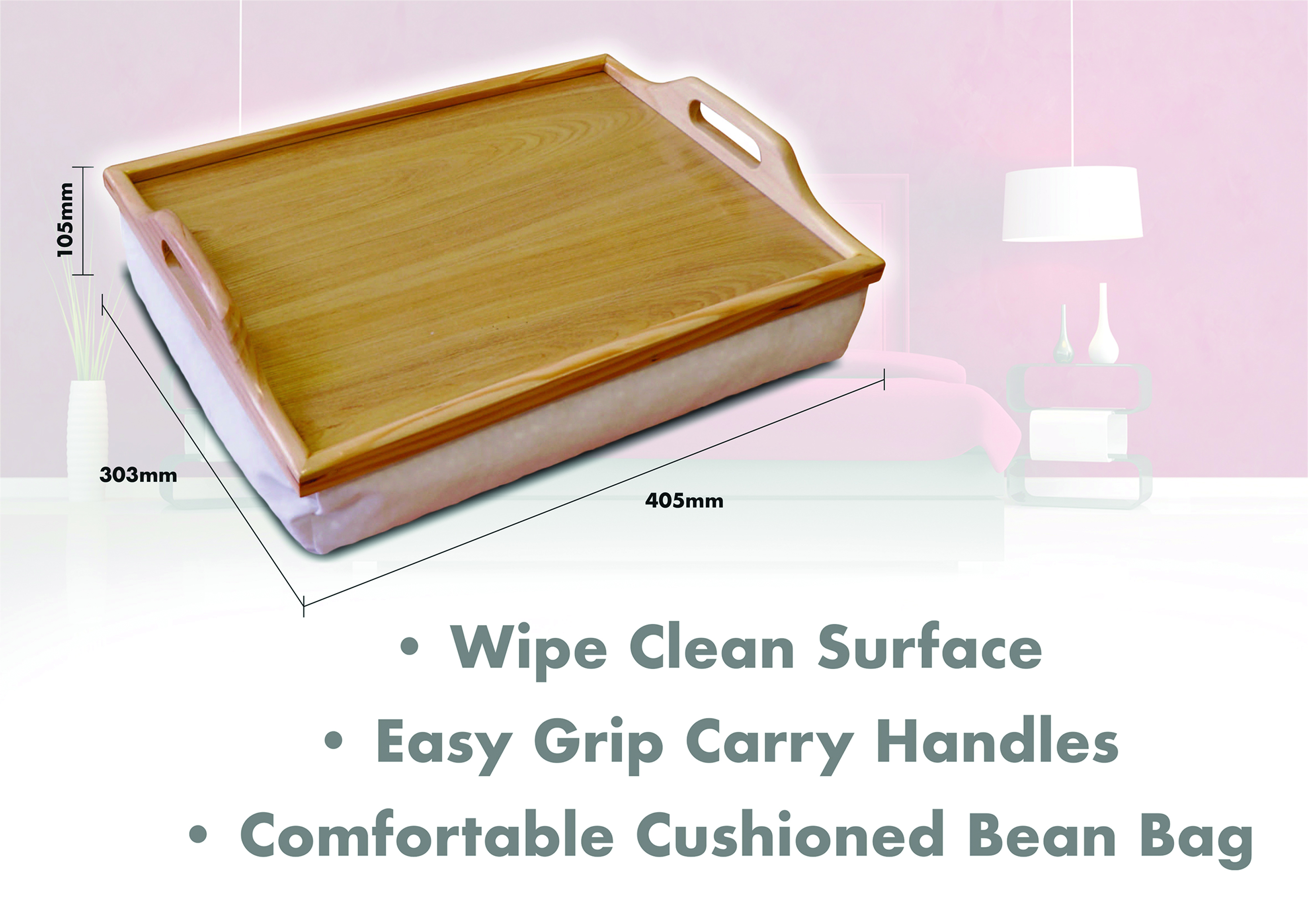 This attractive and functional Lap Tray makes breakfast in bed, reading, writing and crafts easy and comfortable. The lap tray has a built-in cushion below the tray top, finished in plain beige, so will rest comfortably on your legs while you lie or sit. The tabletop surface has a pleasant design that will suit both modern and traditional homes and is laminated for easy cleaning. Featuring handles for ease of carrying and positioning the Lap Tray.