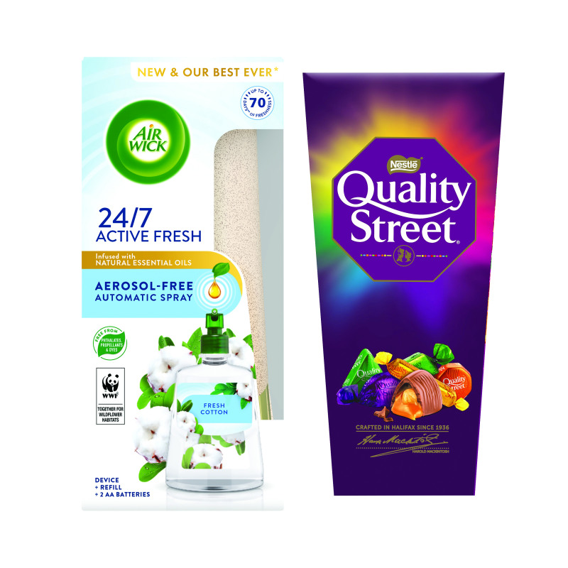 One spritz of Air Wick Active Fresh Air Freshener in Fresh Cotton is enough to fill a room. The aerosol-free automatic spray releases bursts of continuous fresh fragrance so your environment always smells welcoming. Just set the air freshener to your preferred fragrance intensity setting and enjoy while the fresh cotton refill neutralises odours. Fragrances your home, office or bathroom for up to 70 days per refill when on low setting. Ideal for any room, at home, in the office or work environment. This promotion includes a FREE 220g box of Quality Street chocolates.