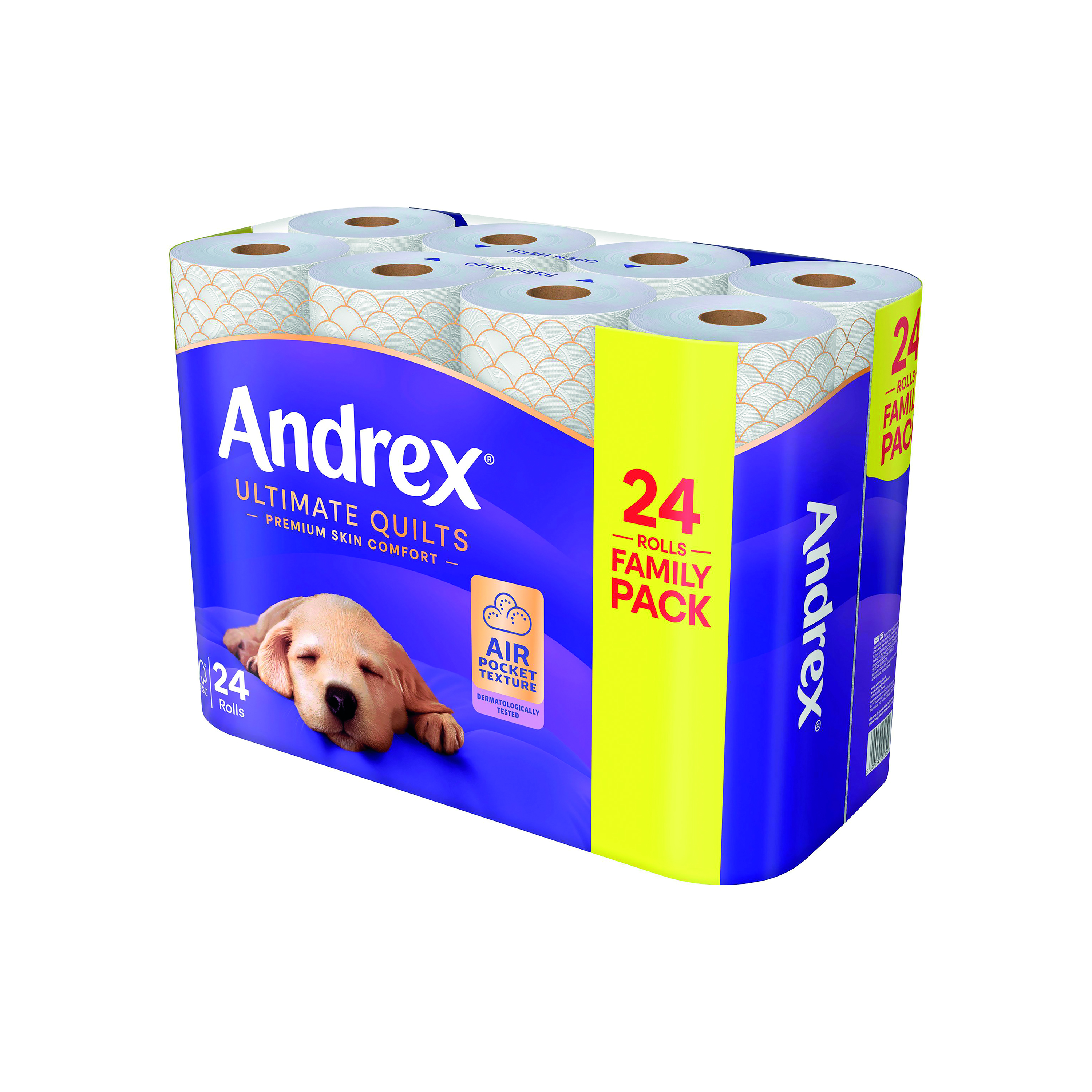 Ultimate Quilts is Andrex's softest and most comforting for skin. Dermatologically tested, the thick, super soft sheets have a unique Air Pocket texture. 3-Ply toilet roll, with 2760 sheets in total, that is approved by the British Skin Foundation. This packaging is made from 50 percent recycled plastic.