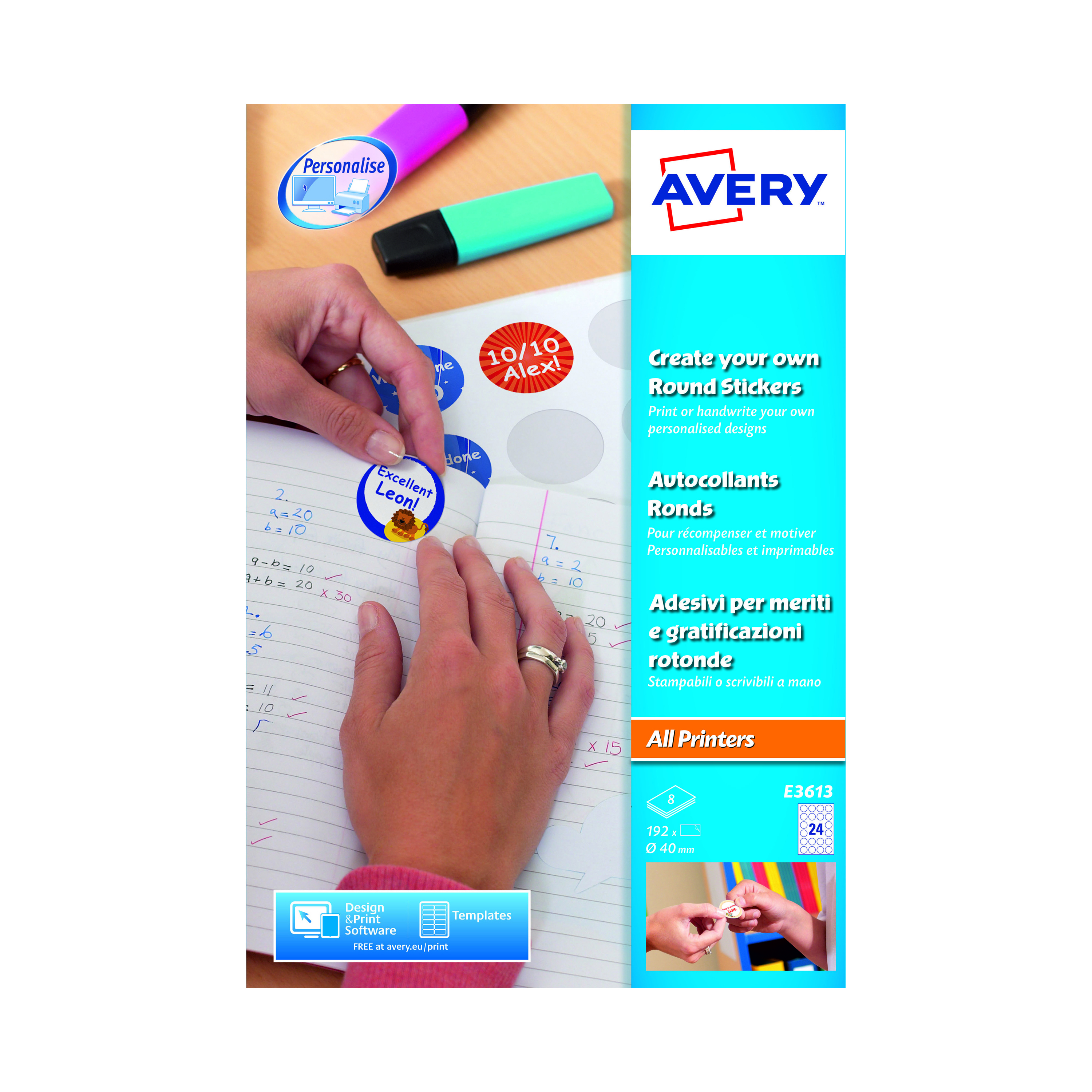 Designed to reward and motivate, these Avery stickers can be personalised for individuals using Avery templates, and are perfect for use in the classroom or at home. Suitable for use in both laser and inkjet printers, these round, white stickers are 40mm in diameter. Print or handwrite a different message on each sticker as you require. This pack contains 8 A4 sheets, with 24 stickers per sheet (192 stickers in total).
