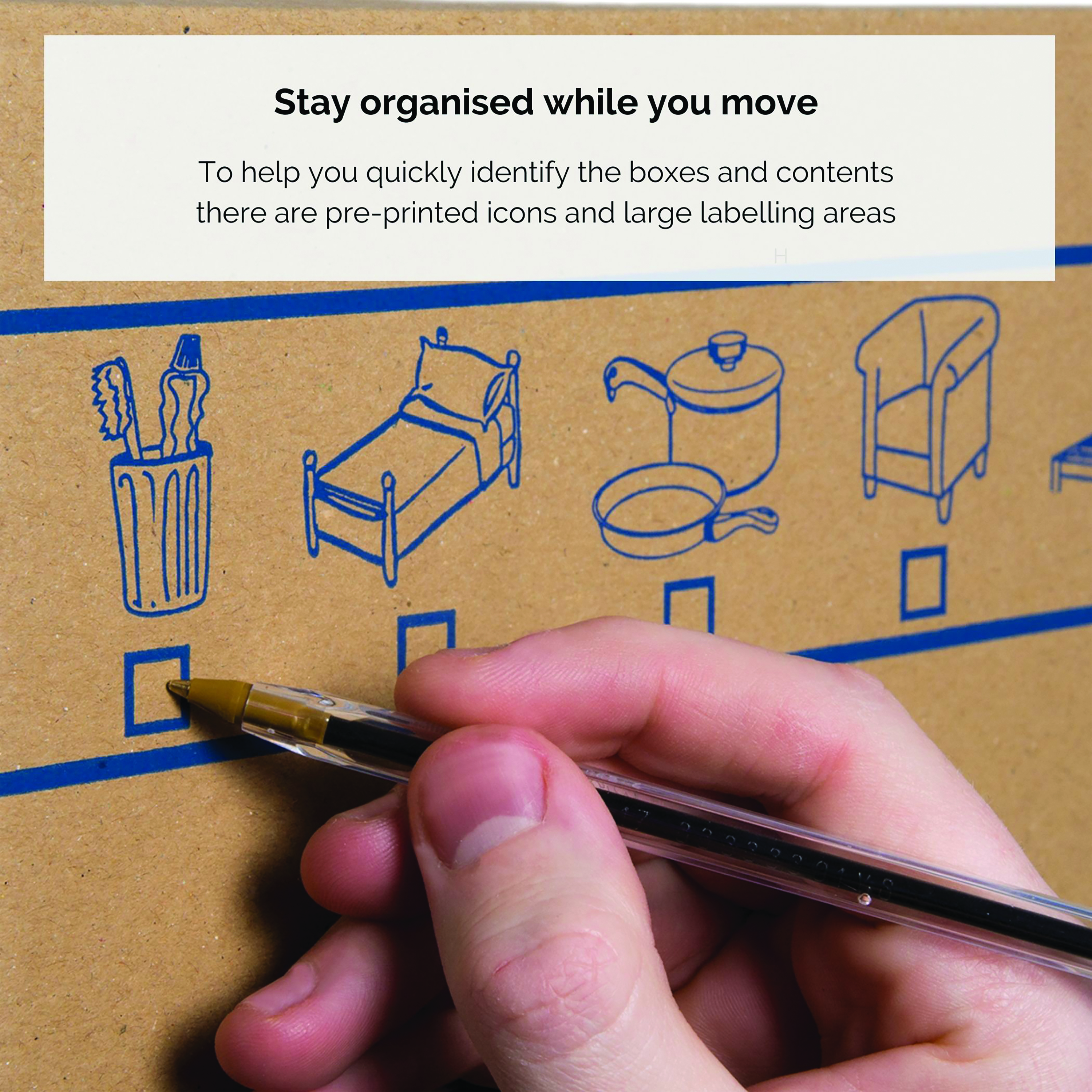 - Organise the whole process of packing and moving with the pre printed icons and a large label area on the cardboard storage boxes which allow you to easily identify the contents