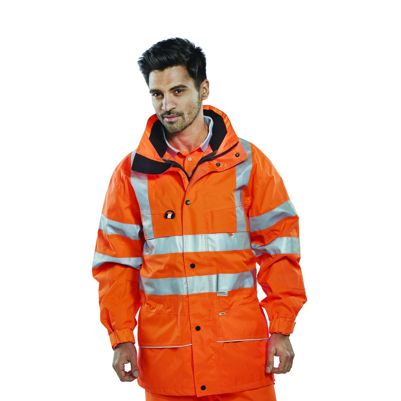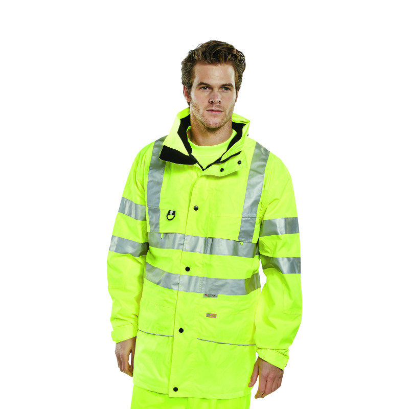 Interactive Breathable Jacket with detachable hood.* EN ISO 20471 Class 3 High Visibility* RIS-3279-TOM - Railway use certified.* EN 343 - Class 3 Water Penetration Resistance* EN 343 - Class 3 Water Vapour Resistance* 100% polyester with PU coating.* Concealed hood.* Mesh lining.* Two-way heavy duty zip front, double storm flap.* 2 lower zipped hip pockets.* Zipped breast pockets with flap.* Hook and loop adjustable elasticated cuffs.* Drawcord at hip.* 3M Reflective tapeFleece available seperately - code: CARF