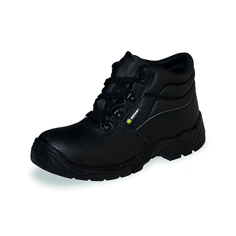 The Beeswift Chukka steel toe cap 4-D Ring safety boot with a PU padded collar and tongue and leather uppers. Includes a 200 Joule steel toe cap and a steel midsole, with a PU oil resistant sole. The boot features an energy absorbing heel to reduce foot fatigue and is slip resistant. Meets standard EN ISO 20345:2022 SBP E FO SR.