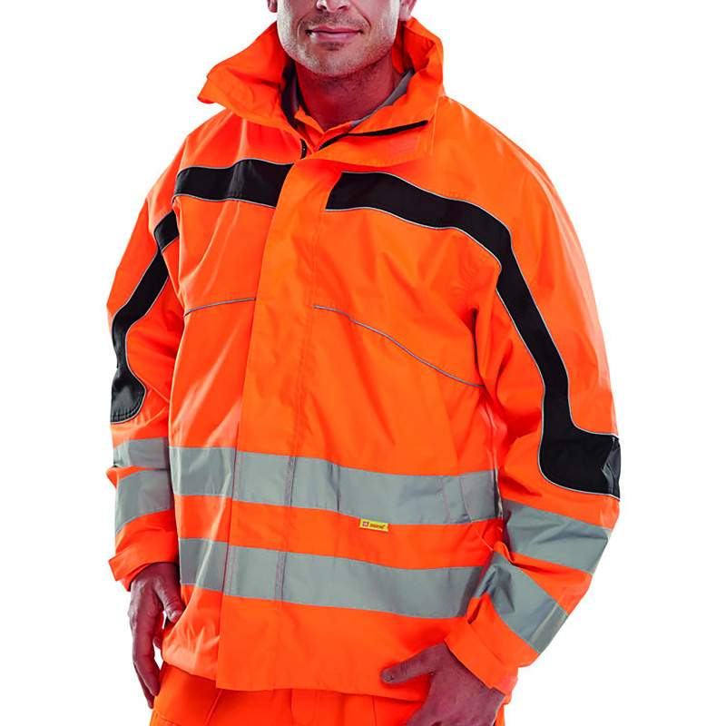 * Breathable PU coated fabric.* Waterproof jacket fully taped seams.* Zip front closure to neck.* Hook and loop fastening storm flap.* Adjustable cuffs.* 6cm retro reflective tape.* Retro reflective piping.* 2 zip fastening front pockets.* Concealed hood.* Hip draw cord.* EN ISO 20471 Class 3 high visibility* EN 343 Class 3 resistance to water penetration Class 3 air permeability