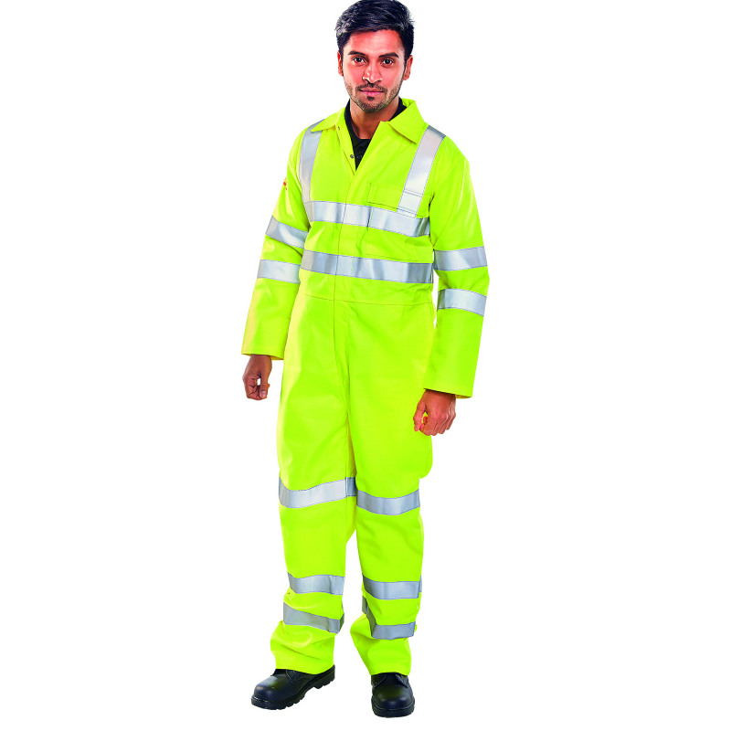 * Multi purpose 'utilties' boilersuit* Fire Retardant* Anti Static* 320gsm Hi Vis flame retardant treated fabric with anti static grid* 80% Cotton 19% Polyester 1% anti static* 2 Vertical side access hip pockets* High visibility* 1 left breast pocket with sewn down flap* Concealed stud fly front to neck* Plain back* Internal knee pouch pockets* Elastic to waist* Plain cuffs and ankles* Retro-reflective tape* FR/AS embroidery to left sleeveEN ISO 11612: 2008 Class A1. B1. C1. - Protection against heat and flameEN1149-5: 2008 - Anti Static - Material performance and design requirementsEN ISO 20471: 2013 Class 3. - Test requirements for high visibility