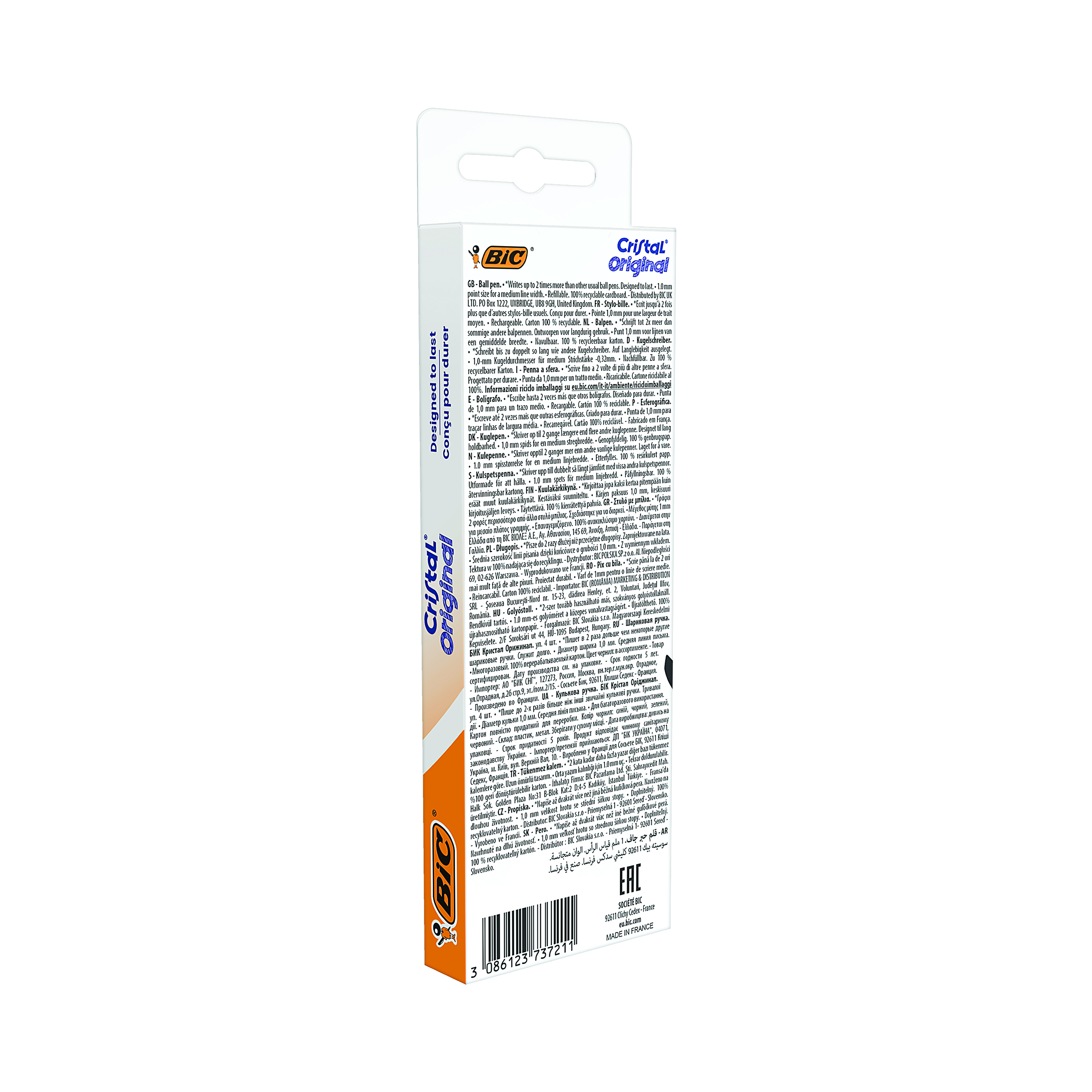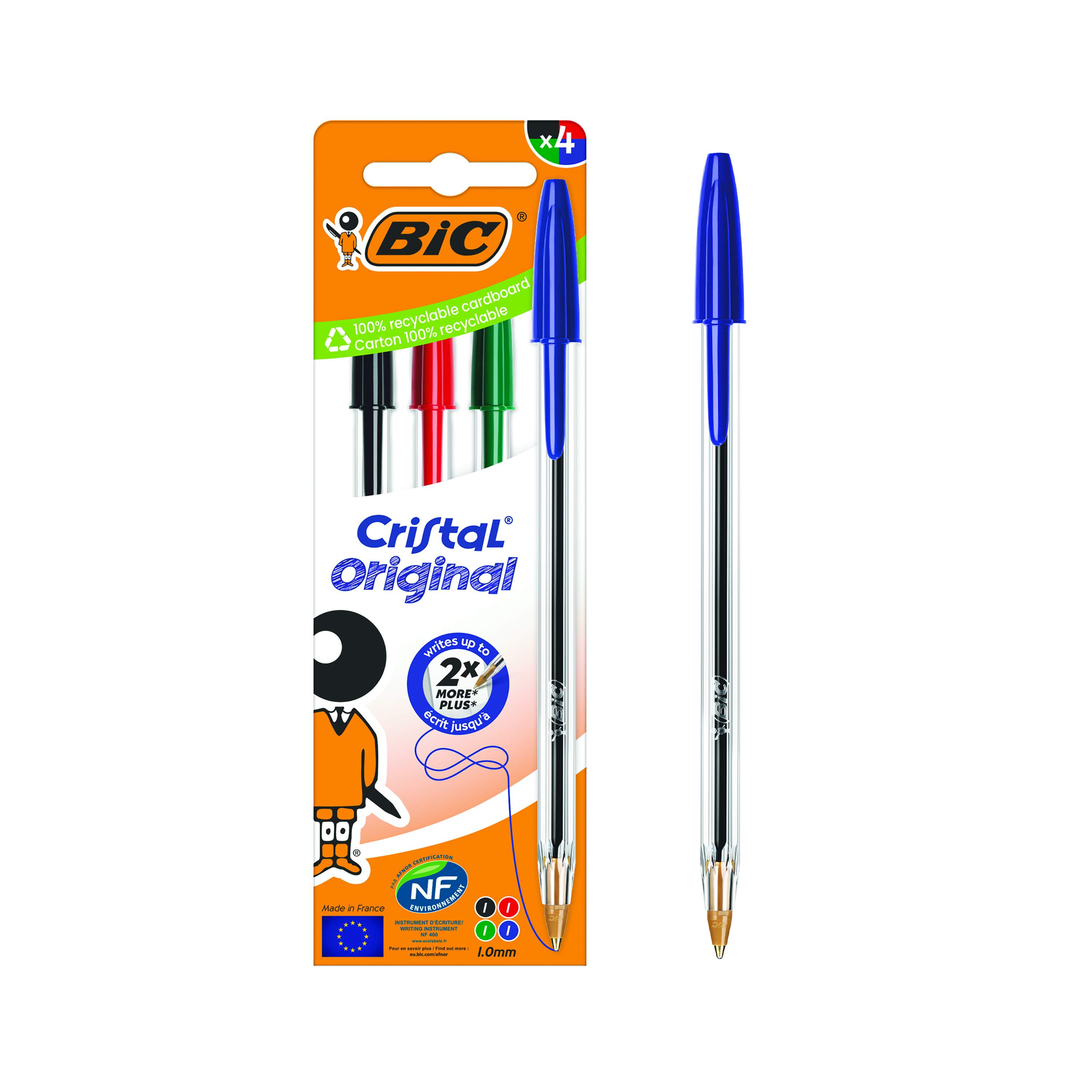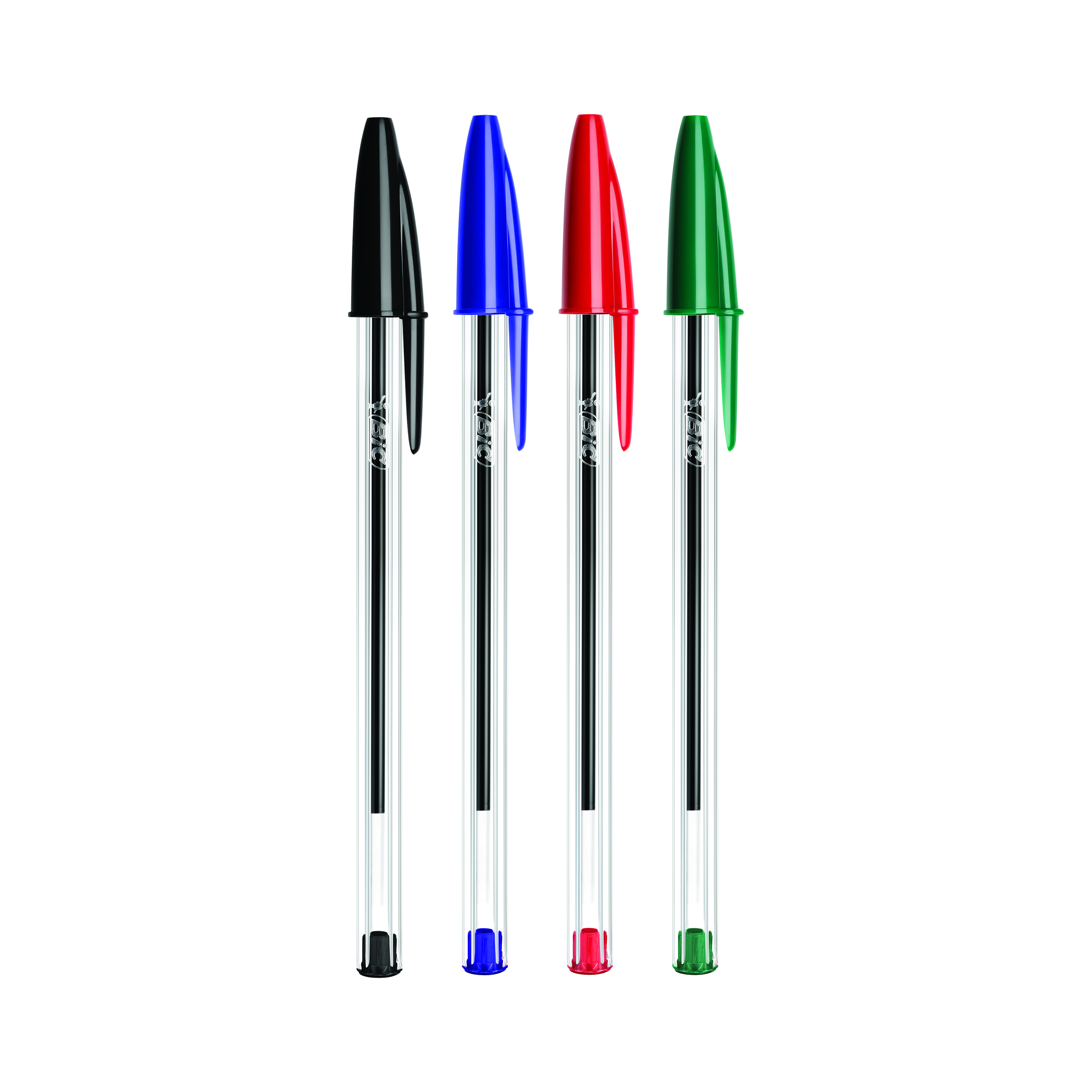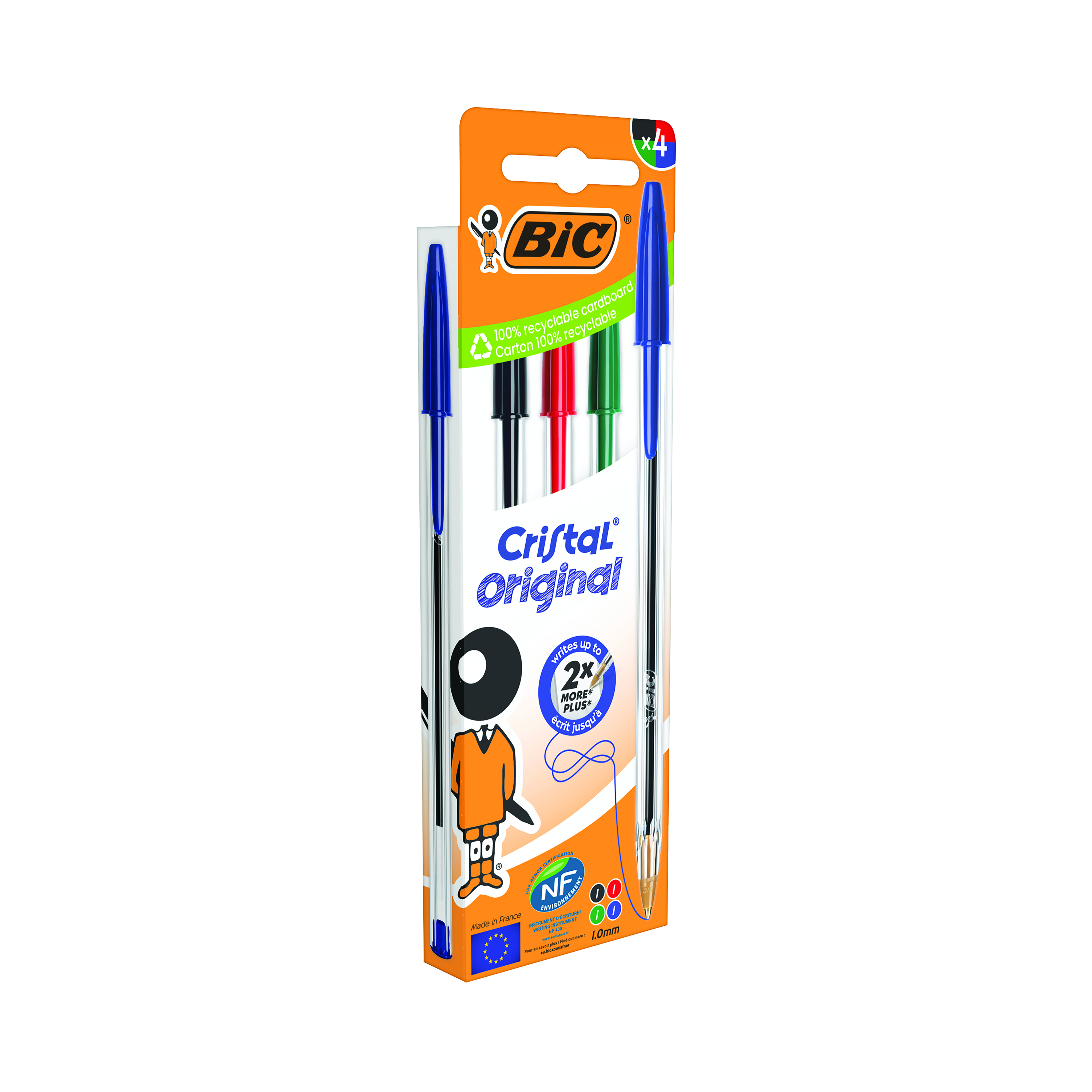 These Bic Cristal Ballpoint Pens feature a durable tungsten carbide ball mechanism and smooth, instant drying ink for reliable, everyday use. The medium 1.0mm tip produces a thin 0.32mm line. The hexagonal barrel includes a coloured cap and end plug that matches the ink colour for easy identification. This pack contains 4 assorted pens in a recyclable cardboard box.