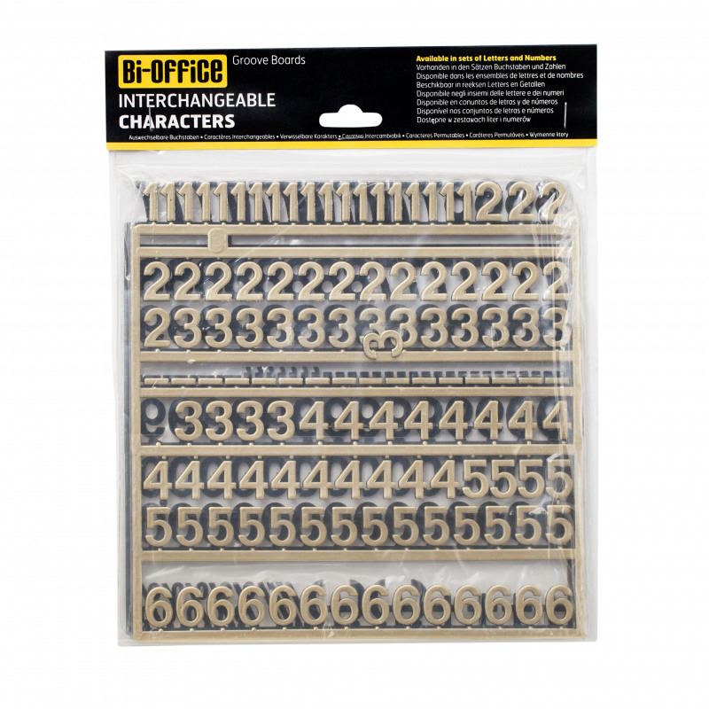 The Bi-Office exchangeable accessories set for grooved letter boards has enough characters for you to create and change messages. Promote your business on a board pavement sign, create a menu board, or a message board for a baby announcement. You can also pep up your felt or cork noticeboard with these golden numbers. These felt letter board characters can be used on any changeable grooved letter board. Each character has tabs that easily slide into position and firmly grip the peg board surface. This is a 264 characters pack.