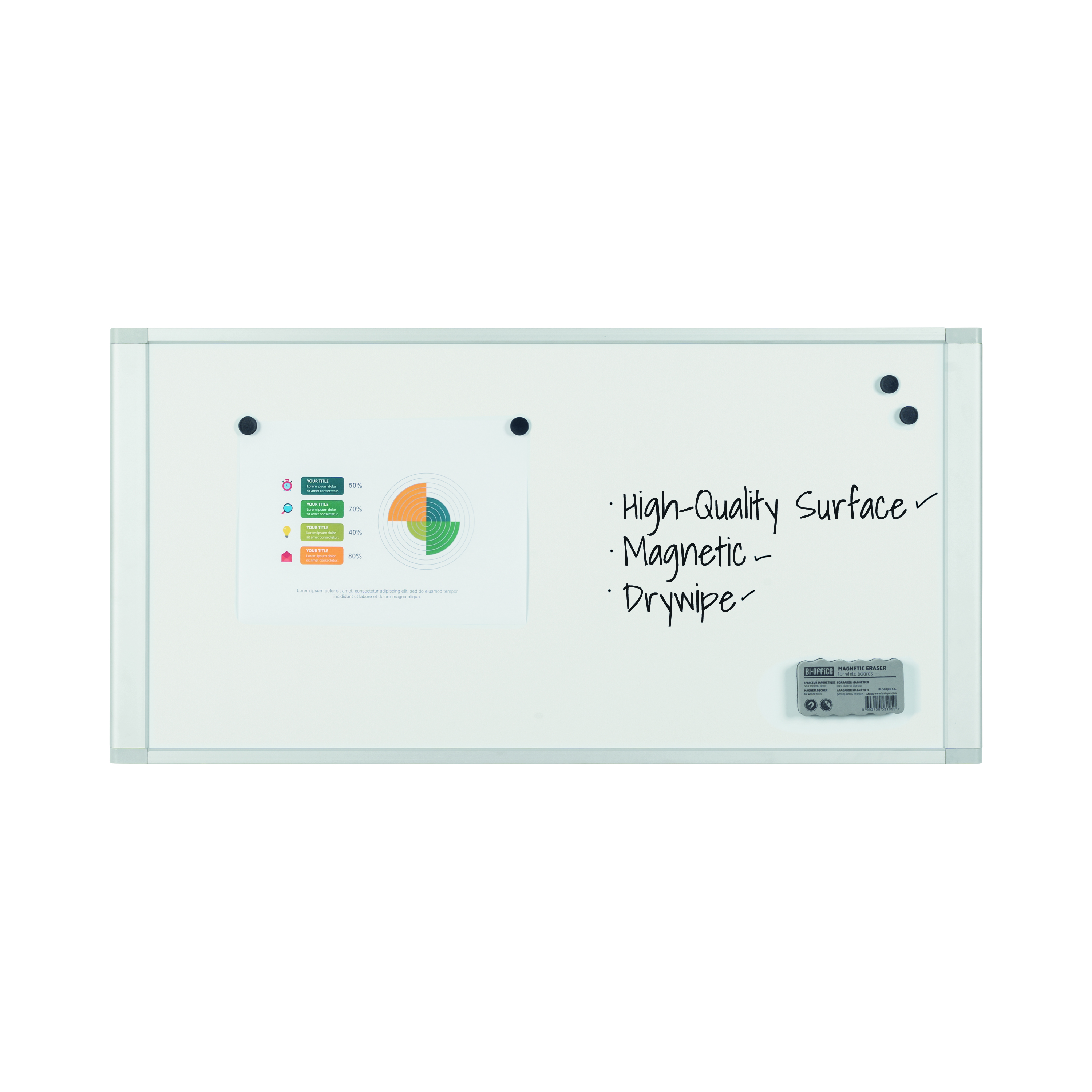 Organize personal work and boost individual / team work performance with the Bi-Office Cubicle Magnetic Whiteboard. This functional desktop board is the perfect fit for cubicle spaces, allowing you to write, erase and do it all over again. Plus, you can also use magnets to display small memos. Its dry wipe lacquered steel surface is suited for frequent use with a 10 years lifespan. Includes a mounting kit for you to hang up and adjust this handy and versatile board as you please.