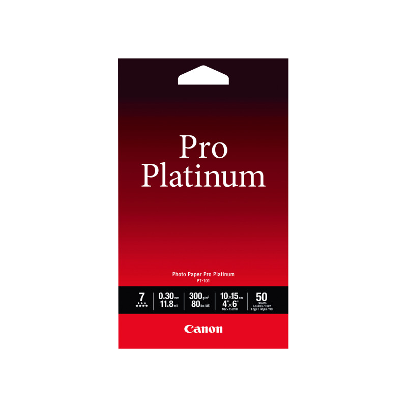 This Canon Pro Platinum photo paper provides a professional studio finish with wide colour reproduction and fade resistance for high quality prints. This 300gsm paper has a smooth, high gloss finish with a microporous coating for fast ink absorption and quick drying photo prints. This pack contains 50 sheets of paper measuring 4 x 6 inches (101 x 152mm).