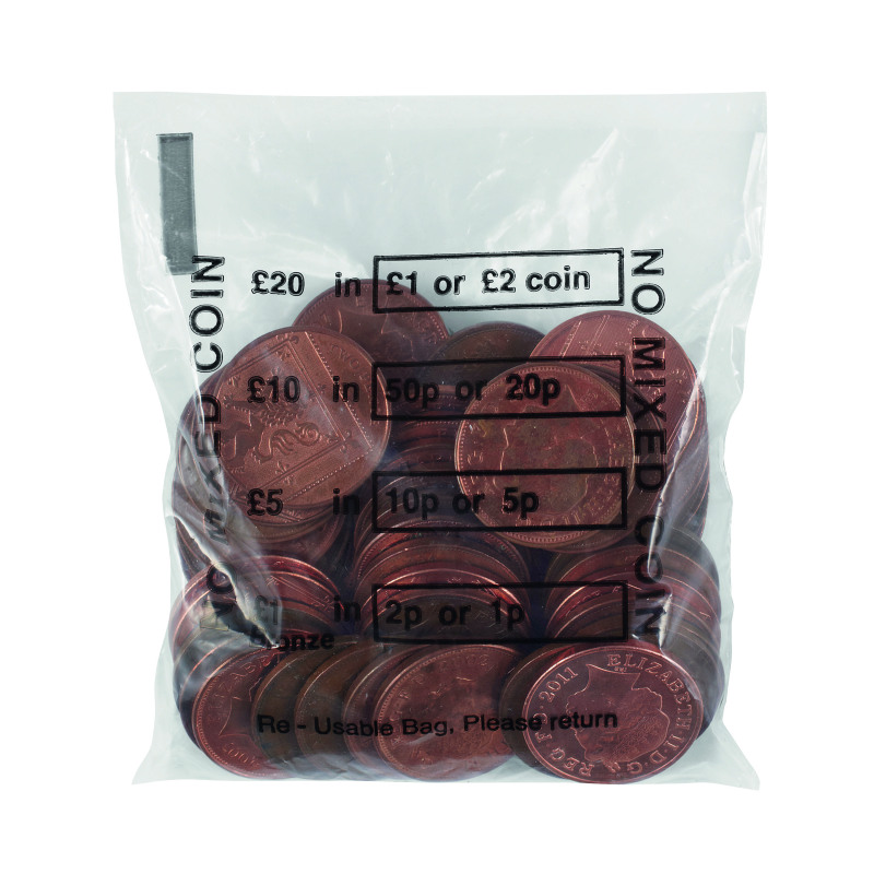 Ideal for retail, hospitality and other cash handling organisation, these standard coin bags are pre-printed with the amount per denomination required for banking coins: 20 in 2 or 1 pound coins, 10 in 50p or 20p, 5 in 10p or 5p and 1 in 2p or 1p. Made from strong, clear plastic the bags can be sealed by securing the flap and are re-usable. This bulk pack contains 5,000 coin bags.