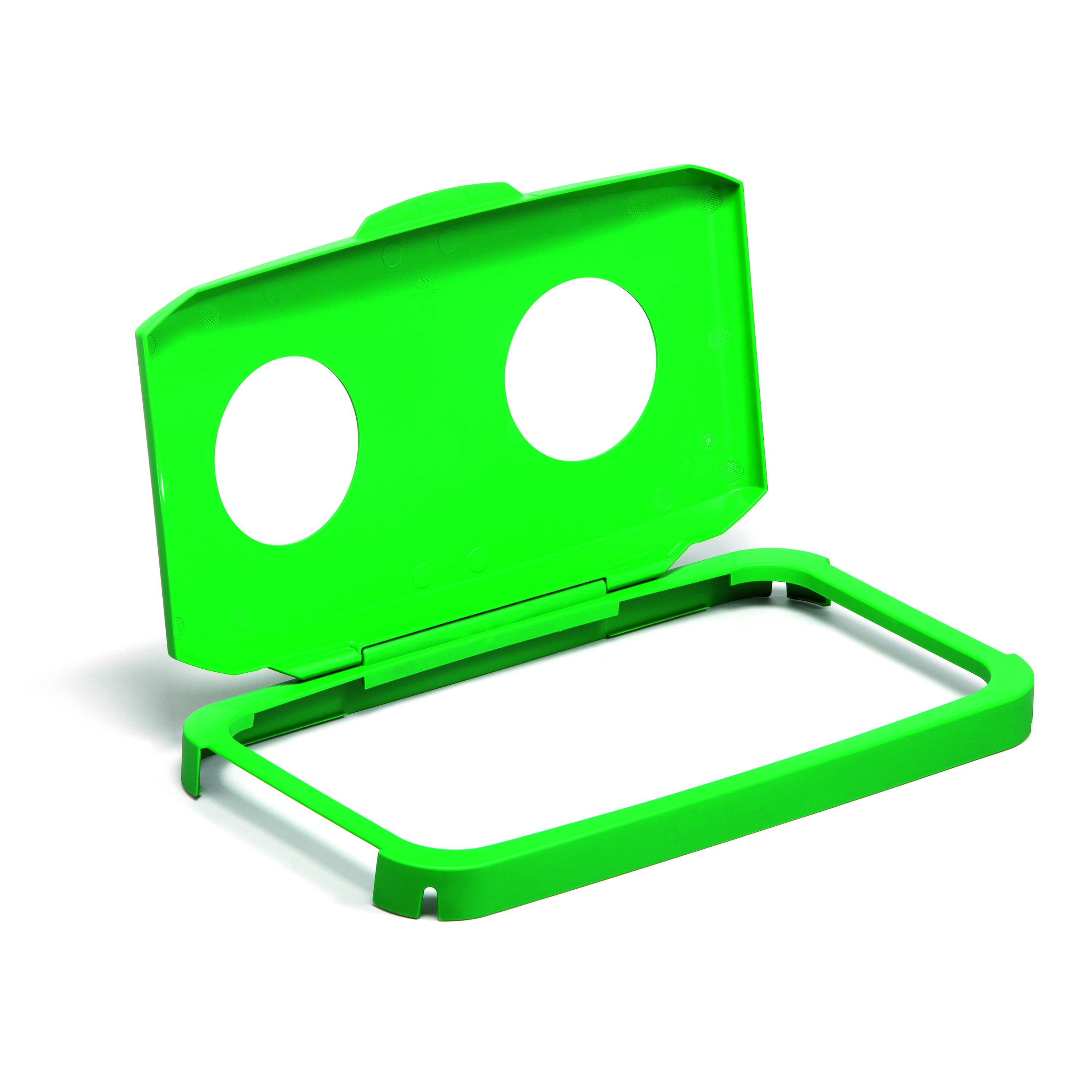 Ensure compliance with the UK's latest waste separation regulations and streamline recycling with the DURABIN® 60L Hinged Bin Lid in Green, featuring two circular holes for the disposal of bottles and cans.