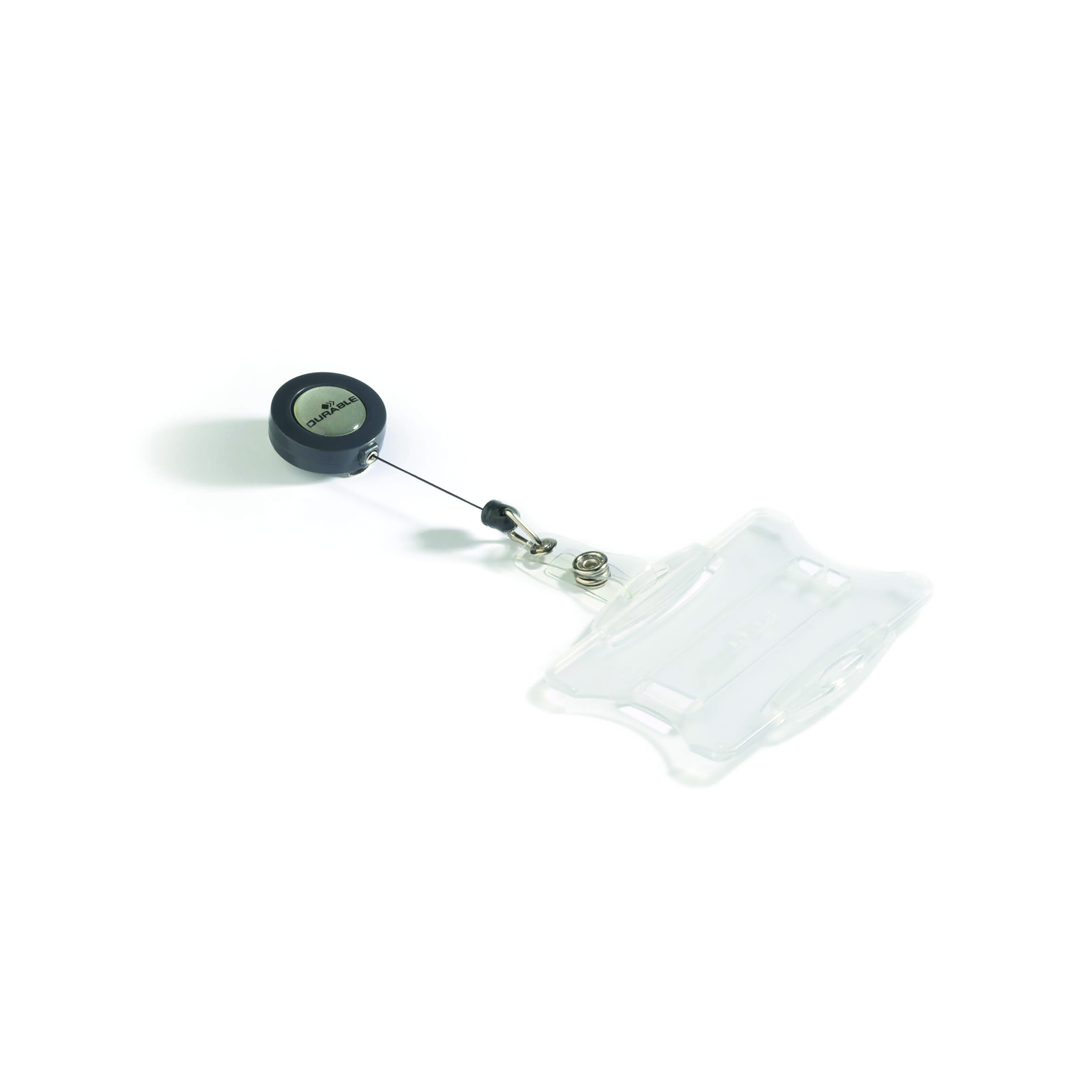 The Durable Security Pass Holder with Badge Reel is the simple and easy solution to keeping your ID badge safe and close to hand. Ideal for storing and presenting ID passes, swipe cards and magnetic cards. The holder has a 800mm retractable cord and a metal clip on the reverse for attaching to belts. The holder can be used in either portrait or landscape format. The insert size is 54x85mm.