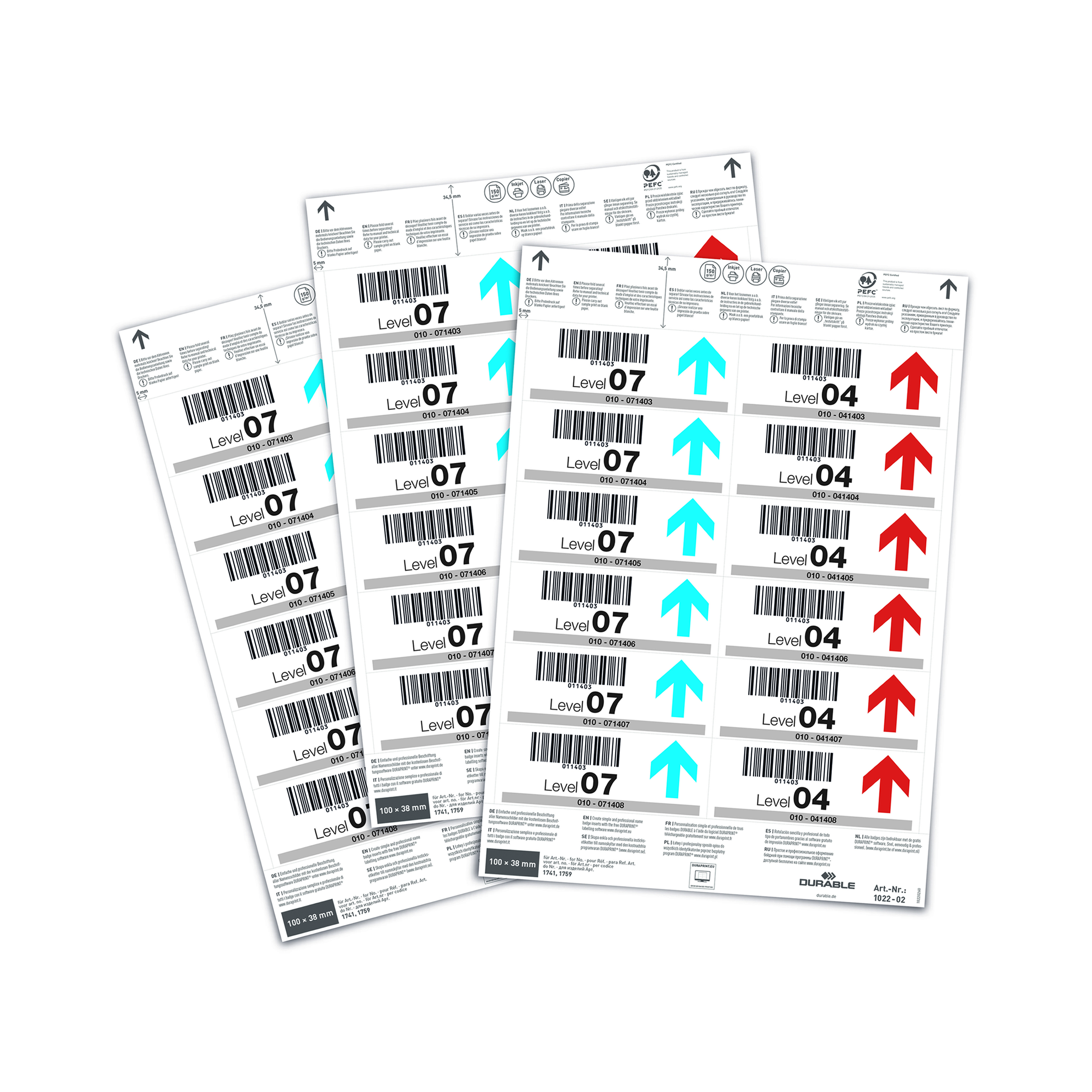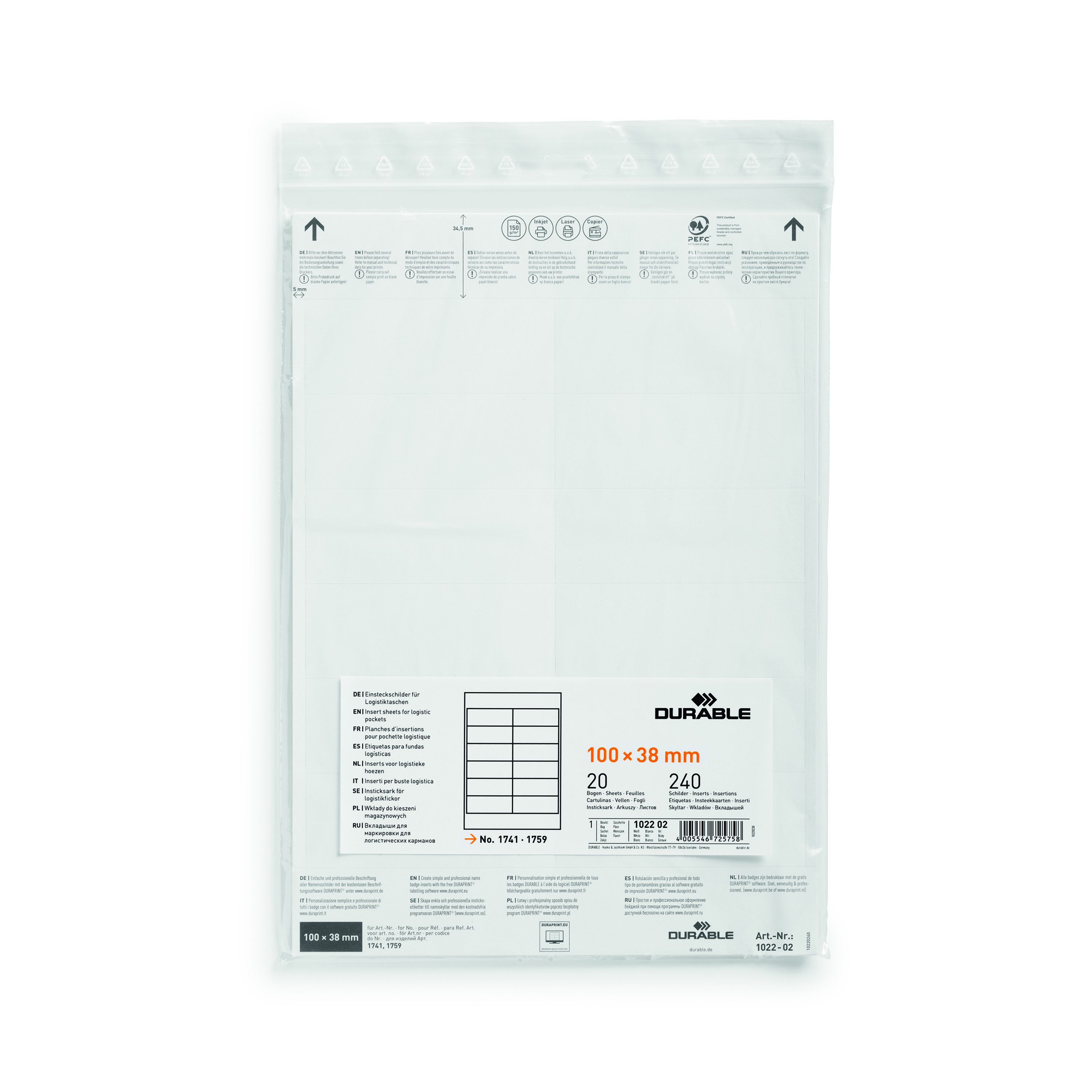 Durable Insert Sheets are micro-perforated insert sheets in A4 format for professional printing of logistical pockets. Suitable for copiers and laser and inkjet printers. Easy labelling with free DURAPRINT software with database function at www.duraprint.de.