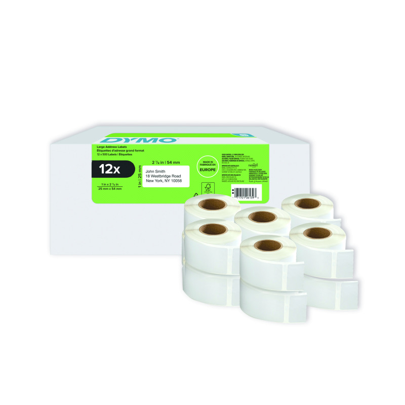 Authentic DYMO LabelWriter Return Address Labels are an efficient and cost-effective solution to all of your mailing, shipping and organisational needs. These large, 25x54mm return address labels provide clear, legible text for accurate delivery of packages. Direct thermal-printing eliminates messy and expensive ink or toner. Self-adhesive, and easy-to-peel labels for fast, precise labelling. Packed in rolls so you can quickly print one label or hundreds with no waste. Compatible with DYMO LabelWriter 450 and 550 Series and 4XL/5XL label makers. Pack of 12.