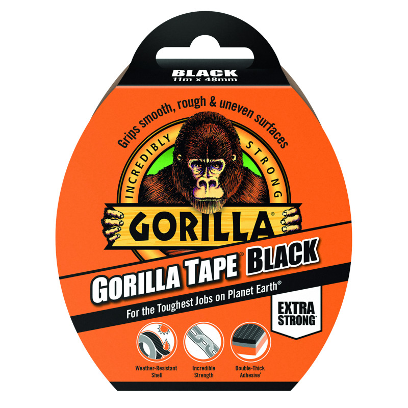 This extra strong, versatile Gorilla Tape is suitable for both indoor and outdoor applications with a tough, weather resistant shell that can withstand harsh elements. The reinforced backing and double thick adhesive provides great grip, even on uneven surfaces, but can still be torn by hand for easy application. This black tape measures 48mm x 11mm.