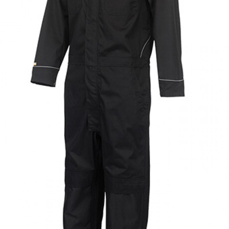 JCB Trade Coverall Black Tall. 65% Polyester 35% Cotton 245gsm. Top loading reinforced oxford polyester knee pad pockets. Action back with side elastication for movement. Two chest pockets with Velcro flaps. Front YKK zip concealed with studded overflap. Two side access pockets. Concealed stud fastening at cuff and ankle. Hi visibility piping and JCB branding.