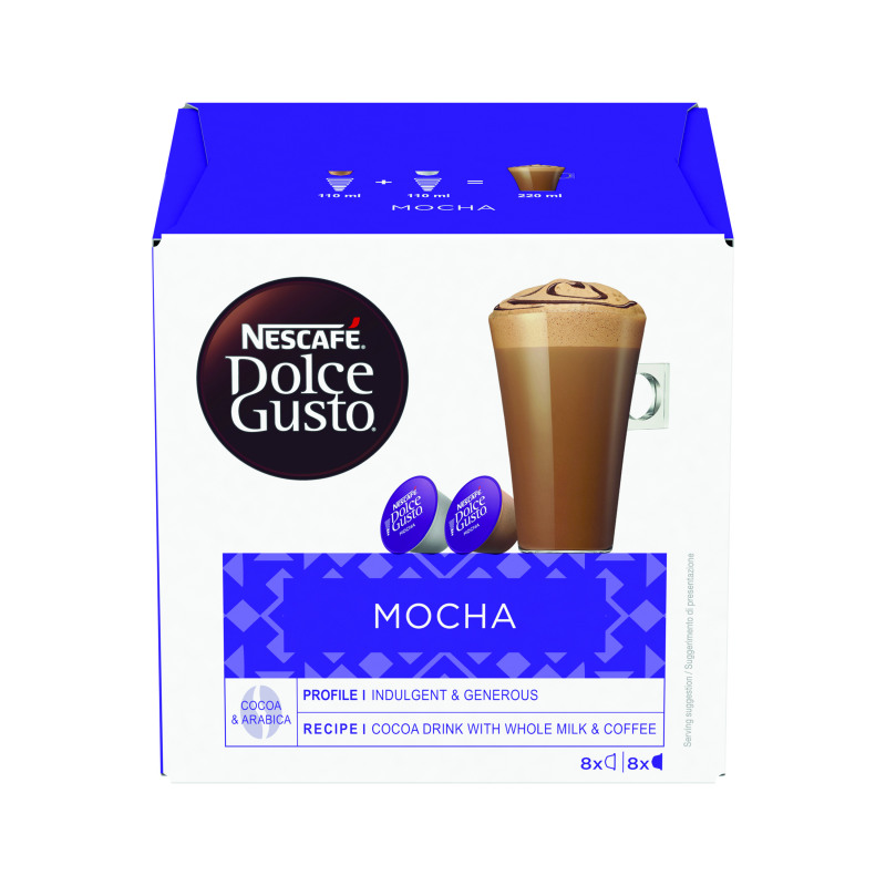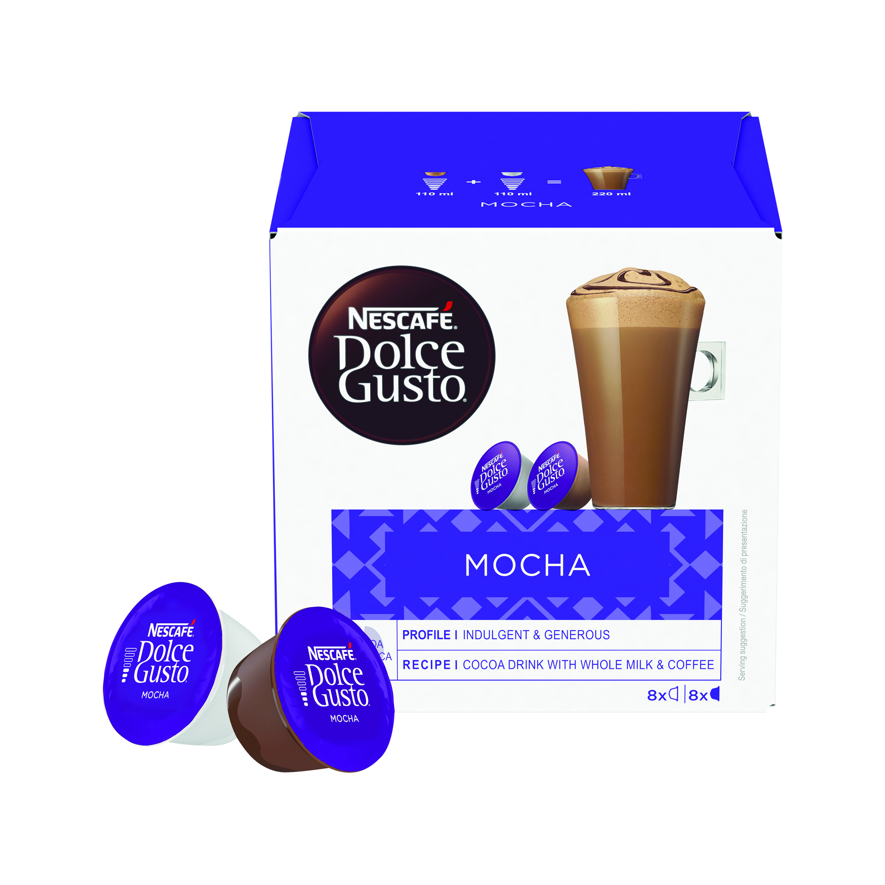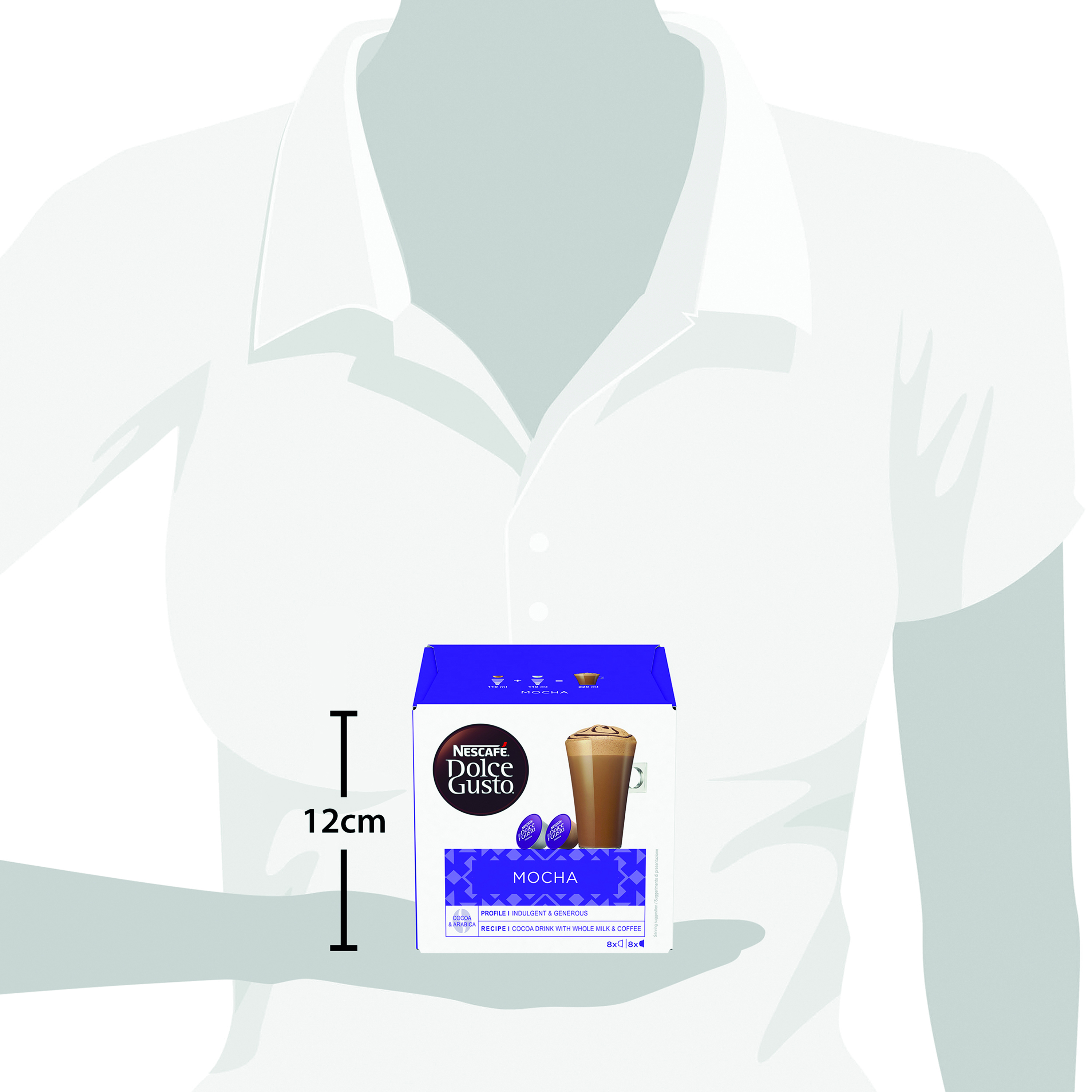 Mocha indulgent and generous. Each capsule contains enough coffee for one serving. Capsules for use with Dolce Gusto coffee machines. Pack of 48 capsules (Supplied in 3 boxes contains 16 capsules in each). Each box of 16 makes 8 drinks, with a creamer and a mocha coffee pod required for each serving.