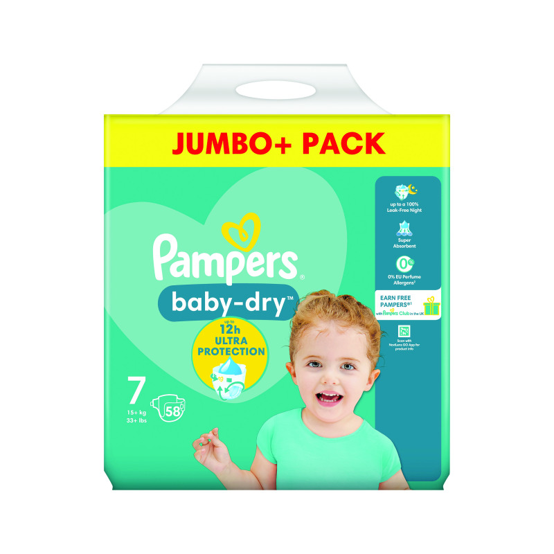 Pampers Baby Dry Taped Nappies have an extra absorbent layer to give your baby up to a 100 per cent leak-free night. With safety leg cuffs and a super absorbent core with stretchy side wings, these features are designed to give additional protection against leaks around the legs whilst providing comfort. Pampers Baby Dry Nappies are also dermatologically tested and contain 0 percent EU perfume allergens as well as being tested and certified according to Standard 100 by OEKO-TEX. These size seven nappies come in a pack twin pack of 58 (116 nappies in total).