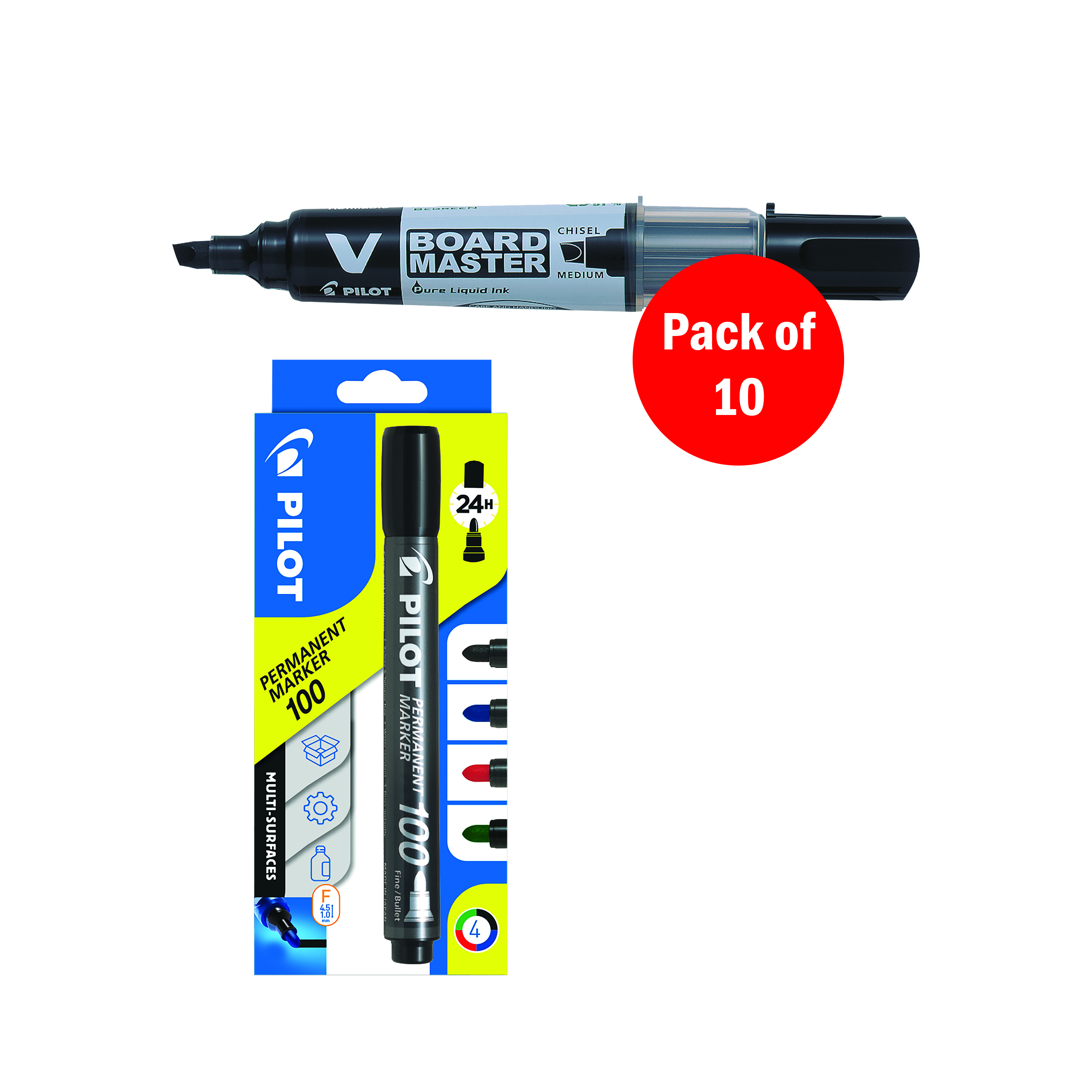 Pilot's V-Board marker pens are an ideal choice for high quality, consistently traceable writing. The non-toxic ink offers full coverage without affecting the whiteboard which can be easily removed with a cloth. The refillable marker pen's regulation system delivers a constant flow down to the last drop of liquid ink through the durable 6mm chisel tip which does not dry out even when left open for several hours. Representing an economical and environmental solution, they are made from 93% recycled plastic (excluding consumables). This promotional pack contains 10 black drywipe markers plus a FREE pack of 4 Pilot 100 assorted permanent markers.