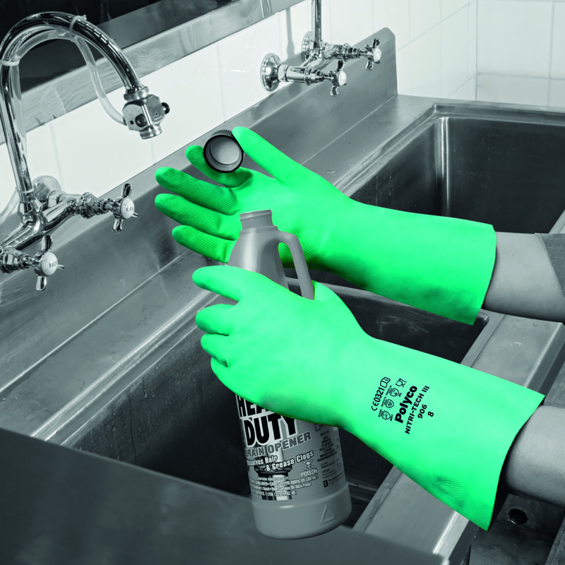 This pair of Polyco Nitri-Tech III synthetic rubber glove is made from durable, stretchy nitrile to reduce the risk of an allergic reaction. The gloves are abrasion and puncture resistant, and protect against a wide range of chemicals including strong detergents, oils and certain solvents. The gloves also feature a non-slip diamond pattern on the palm for improved grip and a soft, cotton flock lining for comfort. The gloves conform to EN388 and EN1149. This pack contains 1 pair of size 8 gloves in green.