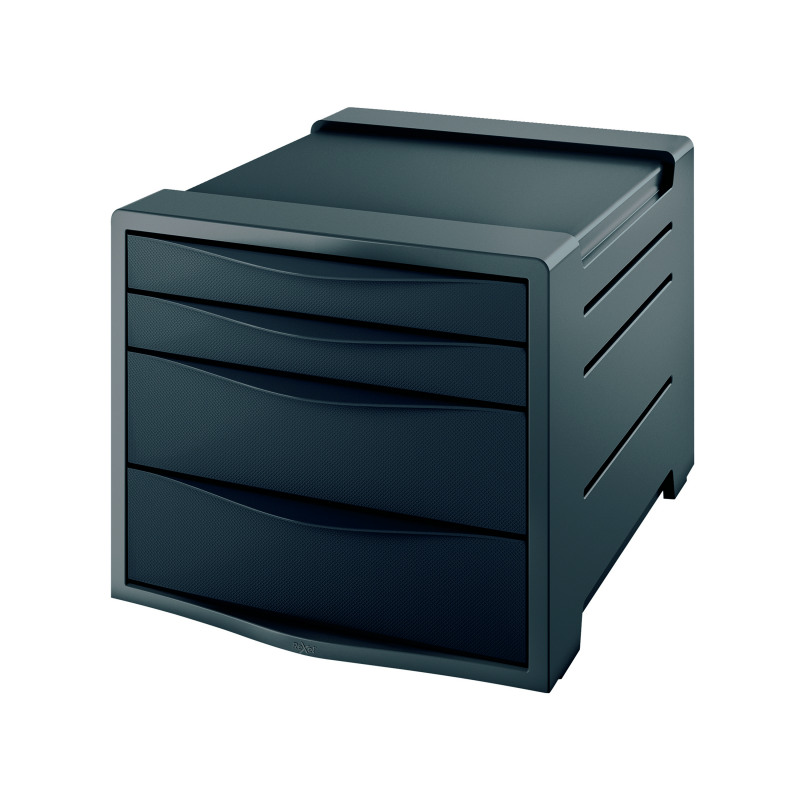 This handy, stylish Rexel 4 drawer desktop cabinet features 2 small drawers for stationery or accessories and 2 larger drawers for documents or bulkier items. The easy glide drawers feature closed fronts for privacy and stops for convenience. The drawer cabinet also features non slip, protective rubber feet and is stackable up to 3 high. Part of the Rexel Choices range for coordinated desktop organisation. This pack contains 1 drawer cabinet in black.
