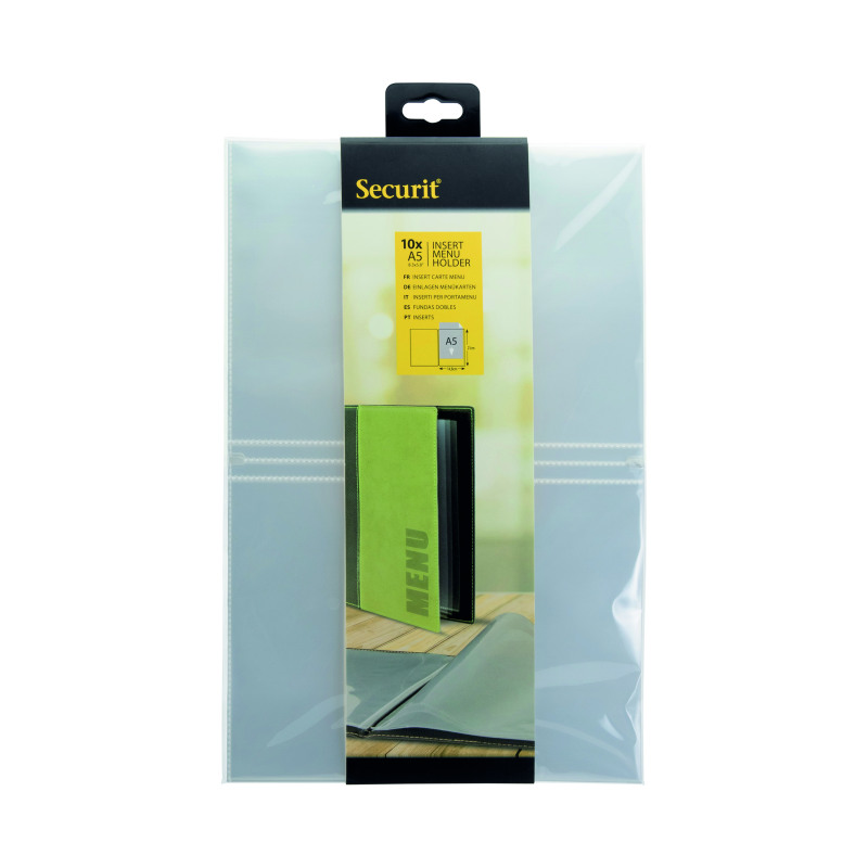 With the Securit A5 Menu Book Covers Inserts you can easily expand your existing menu books. Designed to be used with the expandable Securit Menu Book Covers with an elastic cord. These inserts are made of high-quality, environment-friendly polypropylene. This set includes 10 double-sided inserts, each insert can hold 4 x A5 pages.
