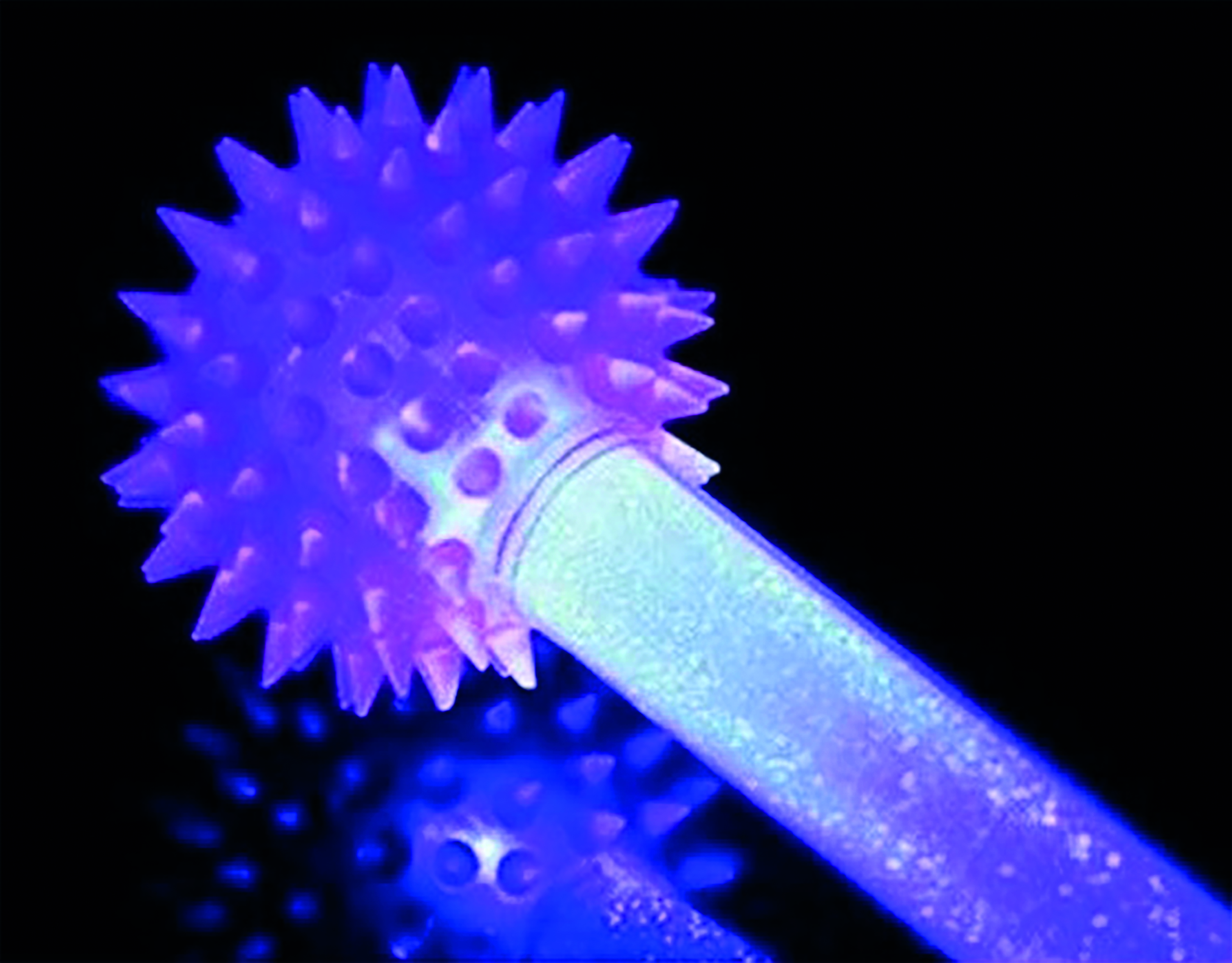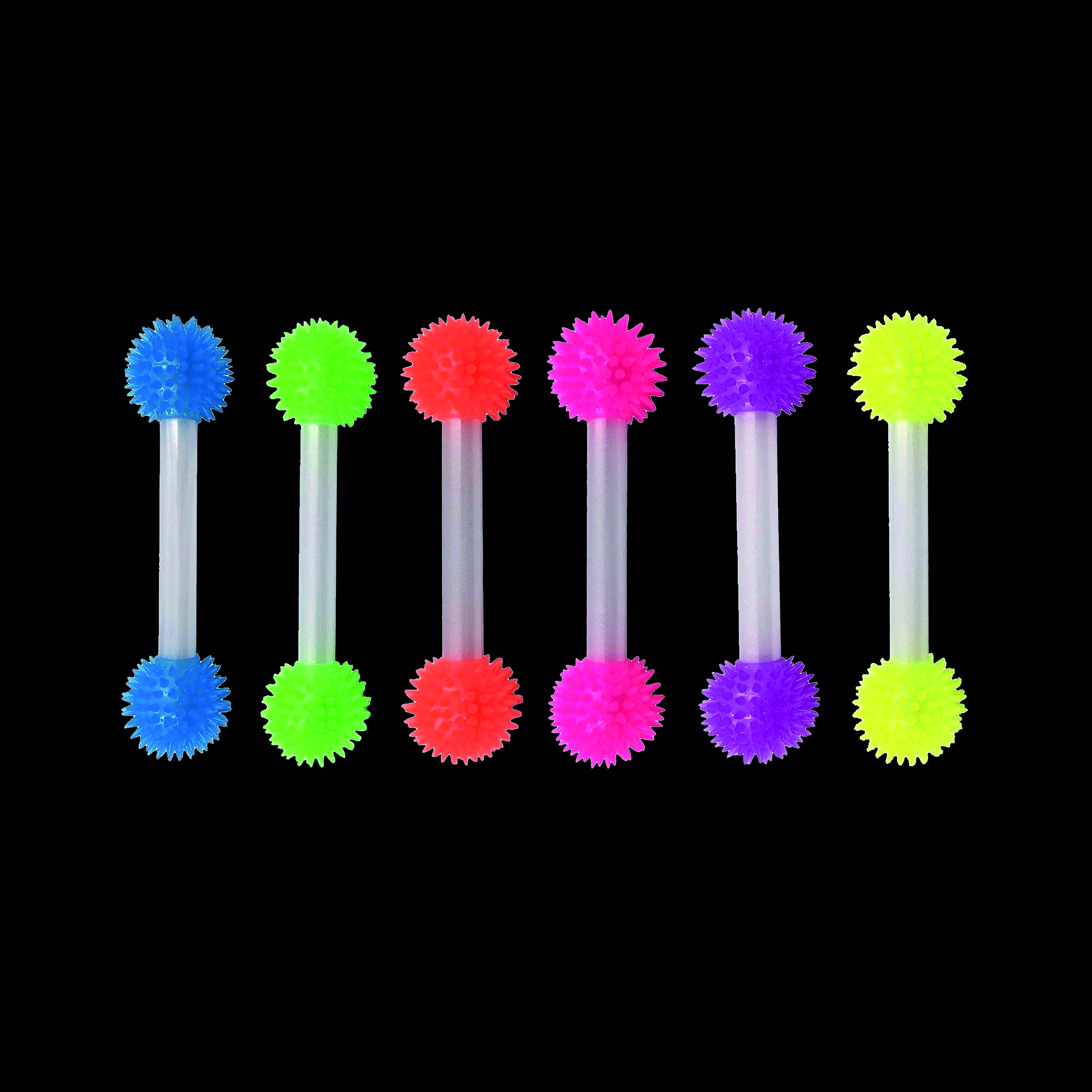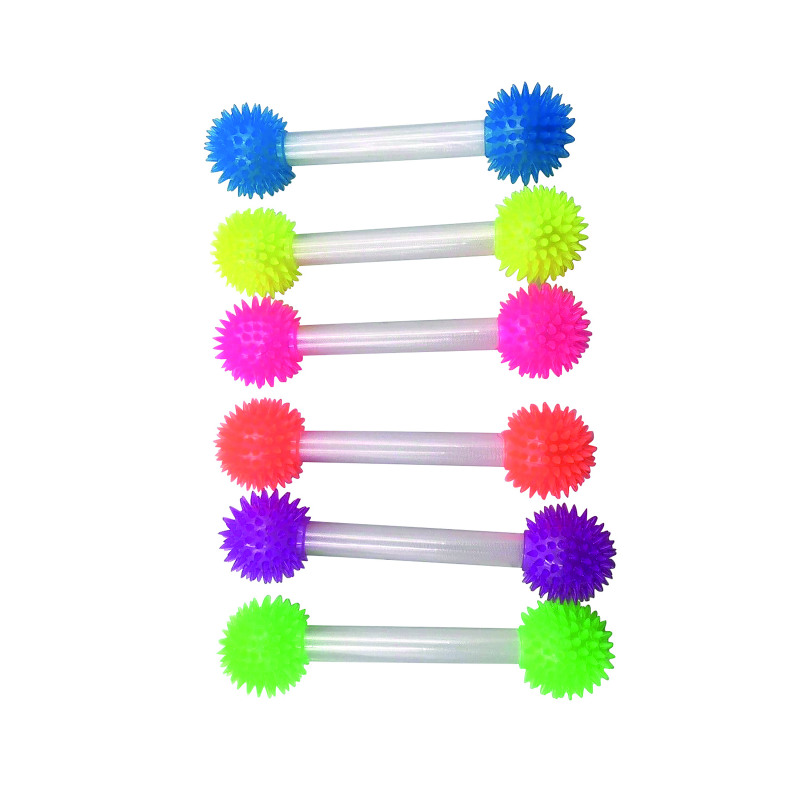 Each Light Up Soft Spikey Ball Double Baton is approximately 430mm in length and has a soft rubber spike ball on both ends which, when tapped, banged or dropped, causes the ball and tub to flash for 10-15 seconds before automatically switching off.