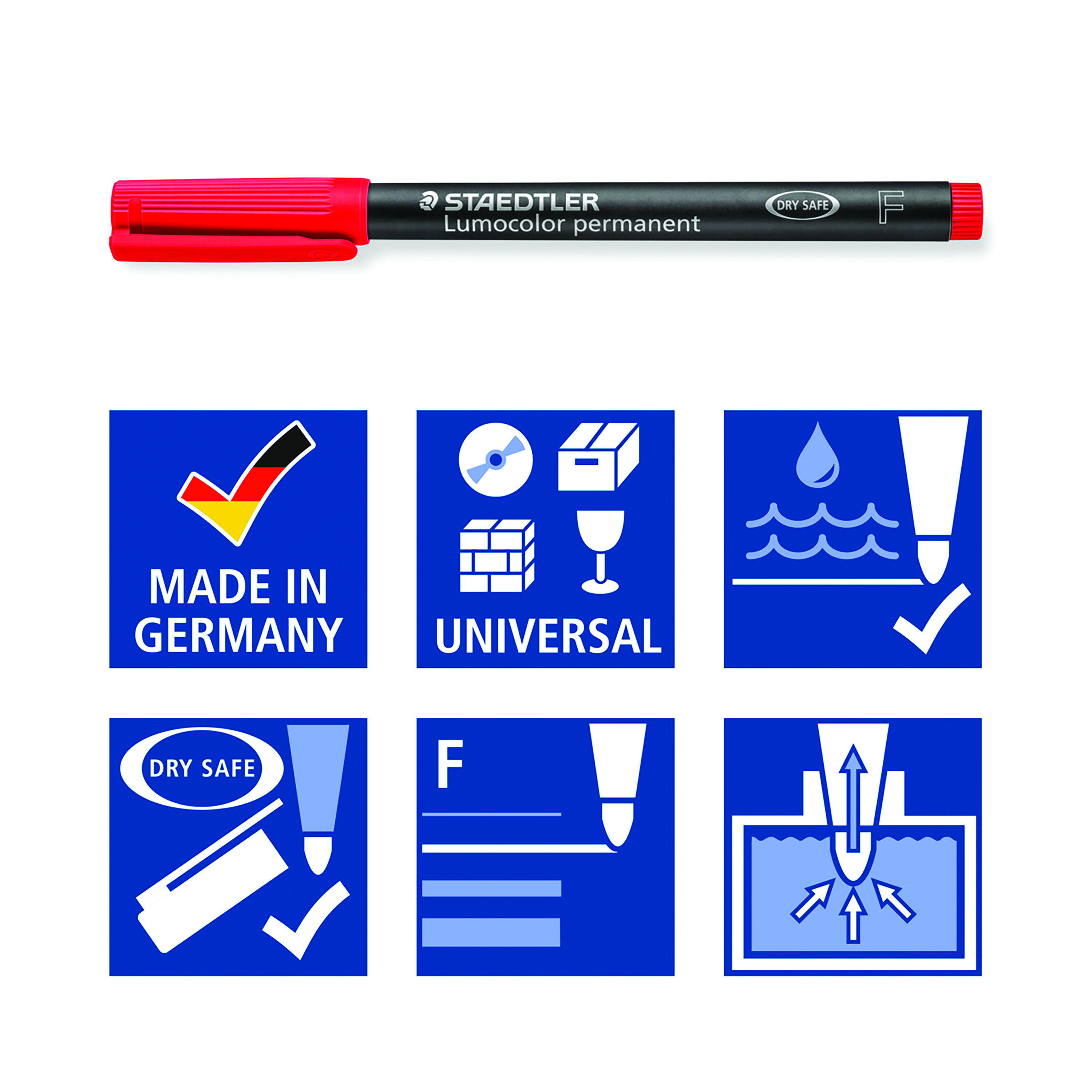 The Staedtler Lumocolour permanent ink pens have been specially developed for use on overhead projection film for stylish presentations. This versatile pen dries in seconds, making it ideal for left-handed users. The fine 0.6mm tip can be left uncapped for days without drying out with the Dry Safe formula. Supplied in a pack of 10 pens with red ink.